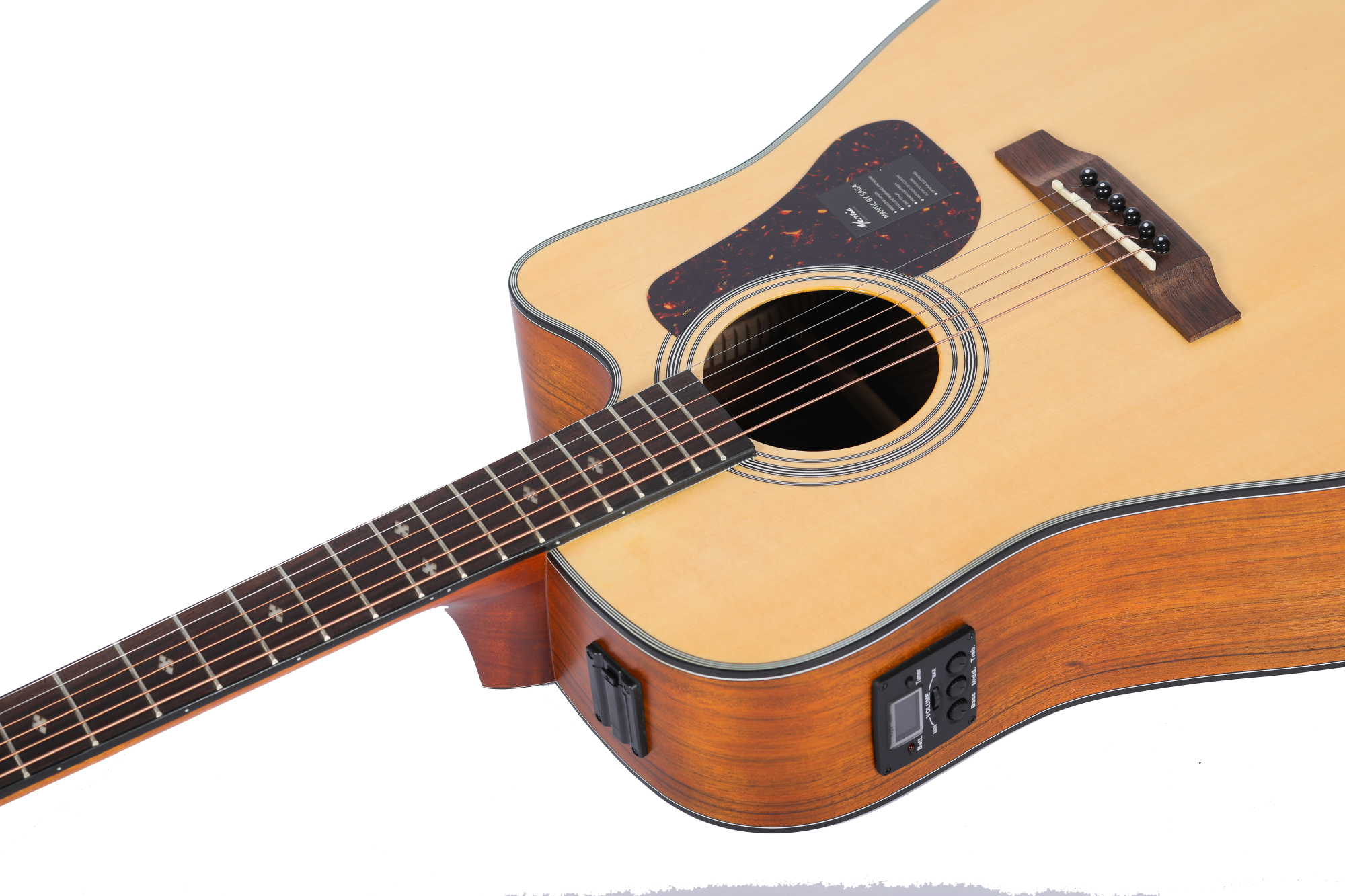 Pickup Mantic A08 của thương hiệu SAGA là hệ thống khuếch đại âm thanh cơ bản nhưng hiệu quả, phù hợp với các dòng guitar acoustic phổ thông. Thiết bị được trang bị đầy đủ các chức năng thiết yếu như nút chỉnh âm lượng dạng trượt, EQ 3 băng tần (Bass – Middle – Treble) cho phép điều chỉnh âm sắc linh hoạt theo nhu cầu người chơi. Ngoài ra, Mantic A08 còn tích hợp tuner điện tử với màn hình LED, giúp việc lên dây trở nên nhanh chóng và chính xác. Đèn báo pin (Batt.) màu đỏ hỗ trợ người dùng theo dõi tình trạng pin để thay thế kịp thời. Với thiết kế đơn giản, dễ sử dụng và hiệu năng ổn định, Mantic A08 là lựa chọn lý tưởng cho người mới bắt đầu hoặc các buổi biểu diễn quy mô nhỏ.