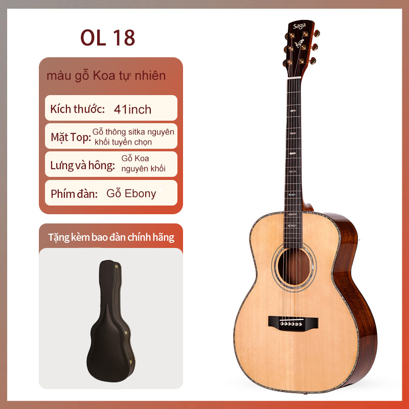 SAGA OL18 – tuyệt phẩm thuộc bộ sưu tập cao cấp nhất của SAGA, là sự kết hợp hoàn hảo giữa nghệ thuật chế tác thủ công và chất liệu gỗ quý hiếm. Với dáng đàn Grand Auditorium cỡ 41 inch, OL18 mang đến sự cân bằng tuyệt vời giữa âm lượng, độ vang và độ linh hoạt – phù hợp cho cả người chơi chuyên nghiệp lẫn biểu diễn sân khấu.