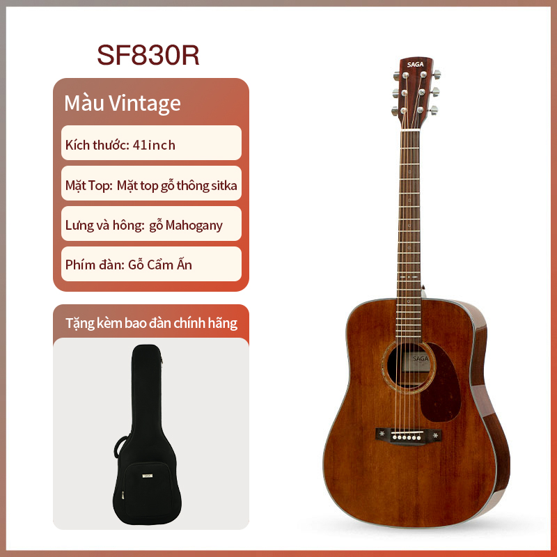 Với mặt Top từ gỗ thông nguyên khối tuyển chọn, Body của đàn được sơn bóng, SF830R thuộc dòng SAGA 830 Series được nâng cấp đáng kể về chất liệu gỗ và thiết kế. Đây là dòng đáp ứng nhu cầu cao về thẩm mỹ, chất lượng âm thanh và sự tinh tế trong từng chi tiết. Được khuyến nghị cho người mới bắt đầu với ngân sách cao hơn, Từ 5,090,000VND.