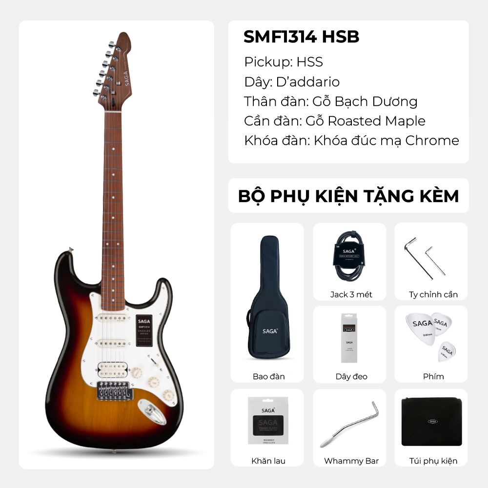 SAGA Dazzles SMF1314HSB thuộc SMF1314 - mẫu guitar điện đầu tiên do SAGA chính thức sản xuất, đánh dấu một bước ngoặt quan trọng. SMF1314HSB sở hữu hệ thống pickup do SAGA tự nghiên cứu và phát triển, mang đến âm thanh mạnh mẽ, đậm chất riêng. Đây chính là điểm nhấn tạo nên bản sắc khác biệt cho SMF1314HSB, đồng thời thể hiện cam kết của SAGA trong việc không ngừng đổi mới và nâng cao trải nghiệm âm nhạc cho người chơi.